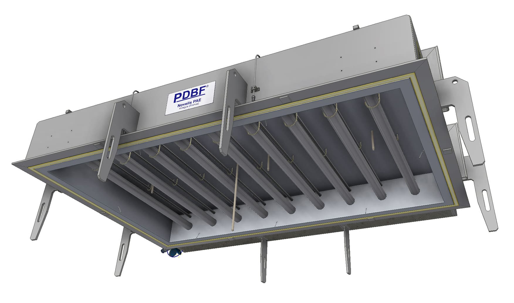 As a worldwide specialist in casthouse equipment manufacturing, Novelis PAE has recently faced many challenges in overcoming the technical issues of developing high-capacity aluminium recycling centres, especially those dedicated to can stock recycling. One of these difficulties was to design and build effective in-line treatment units adapted to high molten metal flow rates, particularly high-capacity degassing and filtering equipment. Building on its 40 years of experience with the PDBF® (Deep Bed Filter), two new models have been developed to widen its product range: the PDBF® 4.5 and PDBF® 6.0. The PDBF® 6.0 features a 6 m2 filtering surface and is designed to accommodate a 150 t capacity DC casting machine for high-end applications. It can accept a flow rate up to 100 t/h. The new model still features a double electrical heating system based on heating elements made of proven and heavy-duty low-voltage resistors protected by an APM tube. One heating mechanism is housed inside the lid, with the other located under the filter bed and consisting of immersion heaters protected by Sialon tubes (patented). This dual equipment design guarantees much better melt temperature control than standard solutions available on the market. Thanks to its 210 kW lid heating power and five sets of 9 kW immersion heaters, there is no need for surface overheating that could lead to creating unexpected metallurgical structures and damaging cast metal quality. One of the PDBF®’s best-known performances is its gradient of less than 15°C from top to bottom, which is remarkable for such a big unit.
