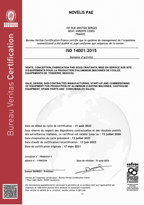 As such, the QHSE management system currently in place, as well as the associated certifications, were established and certified under the former company name Novelis PAE and remain fully valid and applicable following the company’s name change.
